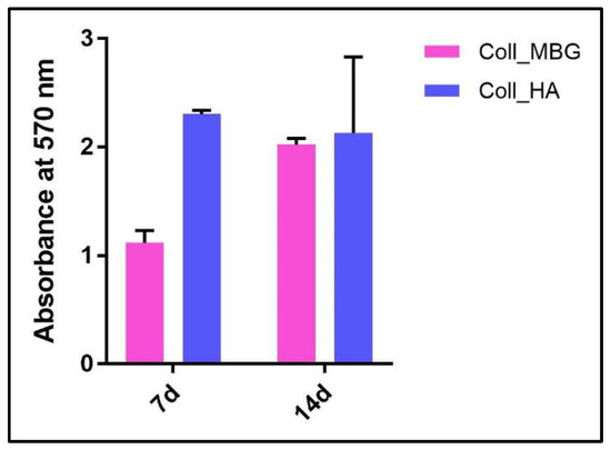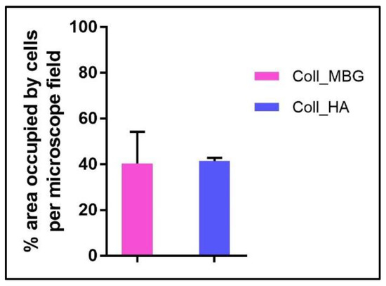 Concerning ARS stain, once performed the staining, the dye can be eluted in order to quantify the positivity for ARS, as reported in Figure 15, where no significant differences were detected between Coll_MBG and Coll_HA.