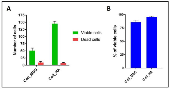 Another informative test is the Live-Dead assay, which allows discriminating viable green cells from red dead cells. In Figure 17 representative images of the stain applied on Coll_MBG and Coll-HA are shown. Once performed the stain, different images are acquired, and the number of viable and dead cells (Figure 18A) as well as the percentage of viable cells can be estimated (Figure 18B), to obtain quantitative information from the assay.