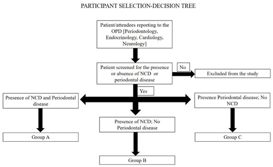 Patients reporting to the Outpatient Department of Periodontology at Manipal College of Dental Sciences, Manipal and Amrita School of Dentistry, Kochi will be screened. If the patient fulfils the inclusion criteria, informed consent will be obtained from the patient. The patient will be allotted to Group A if the patient has any of the NCDs and has periodontal disease and to Group B if the patient has NCDs but no periodontal disease. The patient will be allotted to Group C if the patient has only periodontal disease with no NCDs. The attendees of the patients will also be screened to verify if they satisfy the inclusion criteria. If they satisfy the inclusion criteria, informed consent will be obtained from the participants and they will be allotted to the groups as considered appropriate. Furthermore, after consultation with the departments of endocrinology, cardiology and neurology of the medical college hospitals, patients reporting to these departments will also be screened for the criteria for inclusion in the study. After obtaining informed consent, based on the presence or absence of periodontal disease, these patients will be allotted to either Group A or Group B. The participant selection decision tree is given in Figure 2.