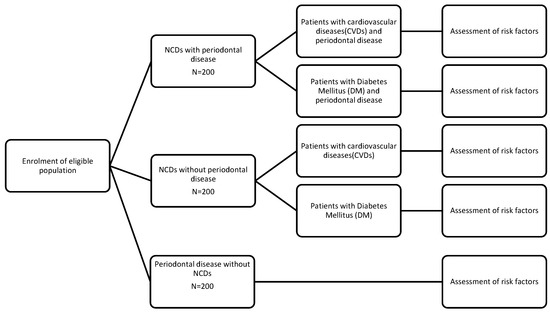 Assuming a prevalence of 40% common risk factors among periodontal disease and any of the non-communicable diseases, with 80% power and 5% alpha error, the minimum sample size in each group was estimated to be 164 per disease group. To account for any missing data, the final sample size per group was increased to 200. Hence, a final sample size of 600 subjects will be selected. A split up of the sample size is given in Figure 3.