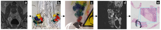 Figure 2. Example of the workflow in prostate cancer. In vivo MRI with a suspicious lymph node in the right obturator fossa ((a) white dashed lined box). Each nodal station was colored and pinned to an anatomical reference drawing to preserve orientation (b). The surgical specimen was vacuum-sealed to fixate the specimen for the ex vivo MRI (c). Due to a short USPIO-MRI interval of 1 day, USPIO particles were still present in the resection specimen. Since there was no loss of signal intensity in this lymph node, it was regarded as suspicious ((d) white dashed lined box). Pathology assessment with hematoxylin and eosin staining showed that this lymph node was metastatic (e).