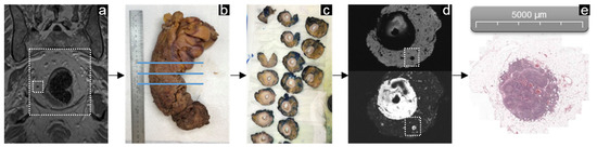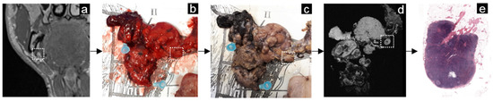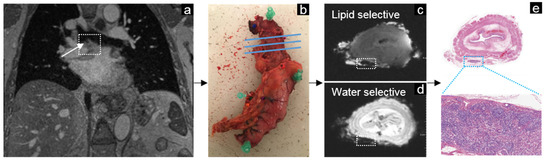 Figure 6. Example of the workflow in esophageal cancer. Lymph nodes were identified on the in vivo MRI after neoadjuvant chemoradiotherapy (a). Nodes could be matched using corresponding anatomical landmarks to the surgical specimen (b) and ex vivo MRI (c,d). The lipid-selective (c) and water-selective (d) ex vivo MRI guided the pathologist towards the lymph nodes for histopathological analysis of each node with hematoxylin and eosin staining (e). The white dashed lined box on the ex vivo MRI (c,d) and pathology (e) contains a healthy lymph node with USPIO contrast (the USPIO surgery interval was 1 day). Therefore, the lymph node lost its signal intensity on the water-selective image.