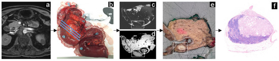 Figure 5. Example of the workflow in periampullary cancer. A transversal view of the T1 VIBE Dixon in vivo MRI showing the pancreas with a suspicious lymph node located dorsally from the pancreatic head in the lined box (a). After pancreaticoduodenctomy, the fresh resection specimen was pinned on an anatomical drawing (b), and an ex vivo MRI scan was performed, on which the same lymph node could be identified on the lipid-selective image (c) and the water-selective image (d). The USPIO-surgery interval was 8 days; thus, USPIO was no longer present in the resection specimen and therefore did not elicit any signal intensity changes. After the ex vivo MRI, the specimen was fixated and sliced into 5 mm thick slices (e). Histopathologic examination with hematoxylin and eosin staining revealed a metastasis within the lymph node (f).