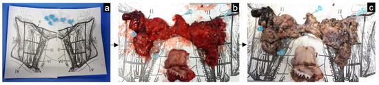 In the head-and-neck cancer patient, the neck dissection specimen was taken out en-bloc. The primary tumor was resected separately. After resection, the specimen was pinned to a grid with a reference drawing of the neck, including its anatomical nodal levels, and fixated with formalin (Figure 7 and Figure 8). Next, the different neck levels were separated. To maintain orientation, pieces were vacuum-sealed in their original configuration with a TissueSAFE plus system (Figure 3) and scanned ex vivo in the 7T preclinical MR system. The cuts, or the boundaries between the neck levels, were visible on ex vivo MRI. All suspicious nodes were individually matched on in vivo MRI, ex vivo MRI, and histopathology. These nodes were cut into multiple sections and stained with immunohistochemistry in addition to standard hematoxylin and eosin staining. All non-suspicious nodes were routinely dissected and processed per neck level. Therefore, this workflow enabled correlation on a nodal basis for suspicious nodes and correlation on a nodal station basis for non-suspicious nodes.