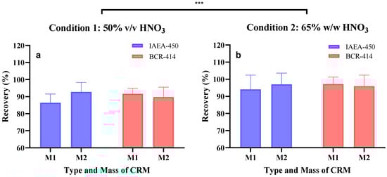 Recovery efficiency in percentage of (a) condition 1 and (b) condition 2 on the different conditions: CRM type: IAEA-450 and BCR-414, and different biomass: M1—3.1 ± 0.6 mg and M2—21.6 ± 1.5 mg. The error bar shows the standard deviation of the recovery values at different conditions. A two-way ANOVA was performed on the recoveries obtained between the digestion conditions and type of CRM used, with the two conditions tested being significantly different (*** p < 0.0005).
