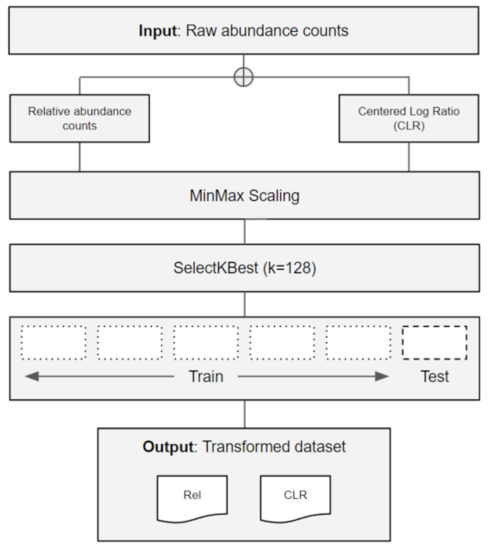 The matrices were transformed into relative abundance (percentage) and using a compositional data analysis (CoDA) method called centered log-ratio (CLR), through custom Python scripts and the Scikit-bio package (https://github.com/biocore/scikit-bio (accessed on 24 April 2021)). The datasets were scaled using the Scikit-learn MinMax function [34], followed by the selection of the 128 most important microbiome features using the SelectKBest function. Each dataset was then split into 6 parts of equal sizes (6-fold), where the first 5 were used as the training set, and the last was used as a hold-out test set and used to perform classification experiments for each task (Figure 1).