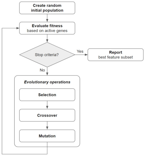 To perform such a feature selection, we first have to encode the GA individuals’ chromosomes as a binary string of genes, included or not in the fitness evaluation. A gene is set to the value 1 if the associated feature is included in the fitness evaluation process and set to 0 otherwise. We used a sparse chromosome initialization strategy for the initial GA generation that activates only a small fraction of the dataset features per chromosome. This was necessary, since a random initialization of the chromosome could result in unnecessarily large feature subsets and the activation of mostly irrelevant features.