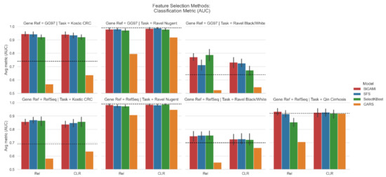 When compared to SFS, BiGAMi achieved a marginally superior or equal classification score for 12 out of 14 experiments, the only exception being the RefSeq annotated dataset for task I. In comparison with the SelectKBest results, BiGAMi shows an improved classification score for 9 out of 14 experiments. Where SelectKBest marginally outperformed BiGAMi by 0.01–0.02 AUC classification metric, SelectKBest only achieved this by selecting substantially larger feature sets of 1.2× to 2.4× of the feature subset sizes BiGAMi selected.