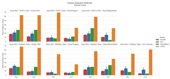 In this study, we compared the BiGAMi classification performance, as well as the size of the feature subsets leading to these performance metrics, against the results achieved by classical feature selection methods, such as sequential forward selection (SFS) and SelectKBest, and GARS, a different GA-based feature selection framework. The results of all experiments underline the value of BiGAMi’s bi-objective fitness function. In 29 out of 42 experiments, BiGAMi achieved a superior performance, either by increasing the classification metrics or by using a smaller feature subset of features. In six experiments, BiGAMi led to a higher performance score using a marginally larger feature subset than SFS or SelectKBest, and in seven experiments, it displayed a marginally lower performance score but still used fewer microbial features (Figure 5).