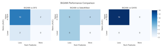 Performance comparison overview between BiGAMi, SFS, SelectKBest, and GARS. The upper left cells are preferred, indicating BiGAMi achieves a higher classification metric using a smaller feature subset.