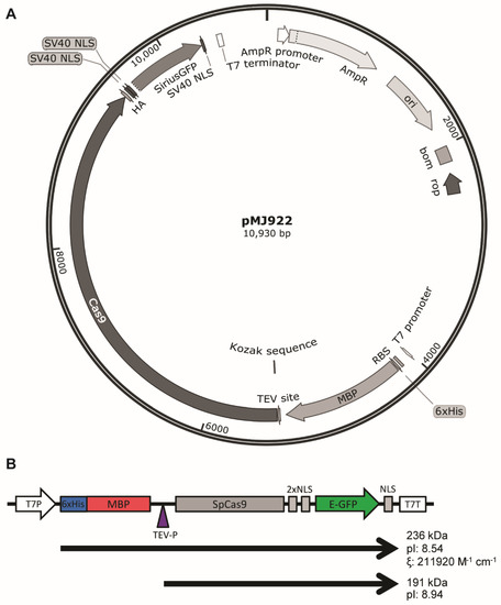 (A) PMJ922 map from Addgene. (B) 6xHis−MBP−SpCas9 NLS−GFP transcriptional unit. 6xHis−MBP can be removed by cleavage with TEV protease. Physicochemical properties for chimeric proteins SpCas9−GFP−MBP and SpCas9−GFP are indicated to the right.