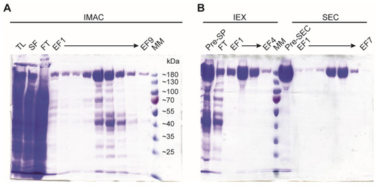 Figure 3. SDS-PAGE run on 10% acrylamide-bisacrylamide gel. (A) IMAC protein samples. (B) IEX and SEC protein samples. TL: total lysate; SF: soluble fraction; FT: flow through; EF: elution fraction; Pre-SP: pre SPHP high trap column; Pre-SEC: pre size exclusion; MM: molecular weight marker.