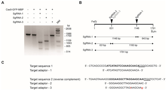Figure 4. In vitro cleavage assay. (A) Separation of cleaved DNA fragments by electrophoresis in 1% agarose gel. A 1791 bp DNA fragment corresponding to Glyma.06G072000 gene was PCR amplified from soybean genomic DNA using FwPr and RvPr primers. Two specific sgRNAs (sgRNA-1 and sgRNA-2) were designed to target different regions of the gene. An additional sgRNA (sgRNA-3), containing two mismatches with sgRNA-2, was designed to assess RNP specificity. The genomic sequence, sgRNA target sequences and primer sequences are listed in Figure S1, Supplementary Materials. The target DNA sequence was incubated with SpCas9−GFP−MBP in the presence (+) or absence (−) of sgRNAs. DNA cleavage resulted in sharp bands. The size difference between large fragments slightly deviates from what is expected, which could be explained by electrophoretic artifact. A weak band corresponding to the uncleaved pcr product can be observed in the gel when sgRNA2 was used for target recognition. MM: λ DNA digested with PstI restriction enzyme. (B) Schematic representation of the target genomic sequence, the position of the sgRNAs target sequences and the expected sizes of the DNA fragments after cleavage. (C) Target sequences and sgRNA spacer sequences (target adaptors) are shown to the right. PAM sequences are underlined, and mismatches are in red.