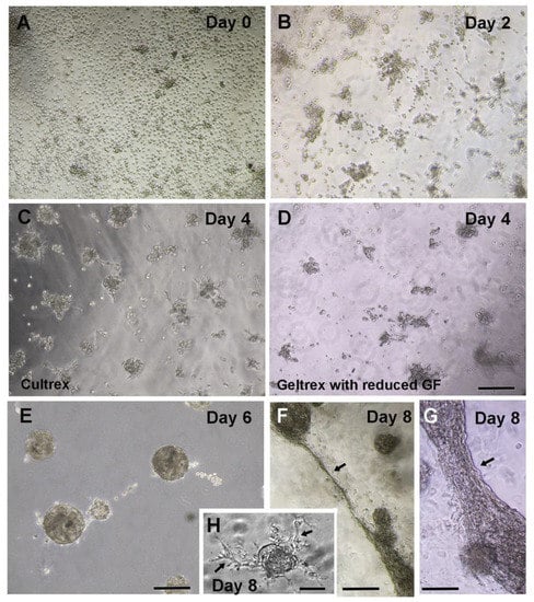 Figure 1. Representative 3-D culture images showing E11.5 embryonic ventricular cells in “cells over the matrix bed method” using Cultrex BME with regular growth factors (A–C,E–H) or Geltrex BME with reduced growth factors (G,F) (D). (A) At day 0, cells are uniformly spread over the matrix immediately after plating. (B) At the day 2 stage of culture, cells start to gather and form small clusters. (C,D) Day 4 stage of cultures show formation of larger or smaller spheroid cell bodies in Cultrex BME (C) and Geltrex BME with reduced GF (D). (E) At day 6, fibrous extensions begin to form between cell bodies. (F) At day 8, spheroid cells bodies are connected by contracting thin (F) or thick (G) filamentous structures indicated by arrows. (H) In addition to connecting fibers, spheroid cell bodies also develop multiple fibrous outgrowths/extensions at day 8 (indicated by arrows). Note: all images were acquired using a 10× objective; Scale bar = 100 μm for panels (A–G) and 50 μm for panel (H).