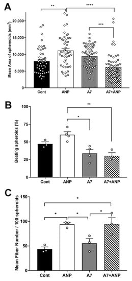 The effects of exogenous addition of ANP (1 μg/mL) and or an NPRA inhibitor A71915 (A7, 1 μM) on the growth and contractility of embryonic ventricular cells grown in 3-D cultures were determined (Figure 2A,B). The 3-D cultures were treated with these agents on alternate days for 8 days (see the timeline chart in Table 1). Previous studies demonstrated the critical role of ANP and its high affinity receptor NPRA in the embryonic ventricular cell proliferation and differentiation [11,14] as well as in cardiac hypertrophy and other disease states [35]. While ANP treatment significantly increased the mean area and the number of contractile spheroid cell bodies, co-treatment of ANP and A7 led to significant decreases in growth and contractility of spheroids cell bodies (Figure 2A,B). Furthermore, ANP treatment significantly increased the average number of fibers originating from the spheroid cell bodies with or without A7 co-treatment when compared to the control 3-D cultures (Figure 2C).