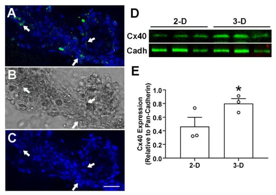 Analysis of Cx40 expression (ventricular conduction system (VCS) marker protein) in 2-D and 3-D cultures of E11.5 ventricular cells. (A) Representative merged confocal image of 3-D cultures stained with Cx40 antibodies (green, arrows) and Hoechst nuclear dye, (B,C) The same field was imaged under brightfield (B) or Hoechst fluorescence alone (C). A–C: Arrows indicate the relative location of Cx40 expressing cells, Bar = 50 μm, (D) Western blot analysis of Cx40 in membrane lysates extracted from three independent samples each from E11.5 ventricular cells cultured in 2-D (N = 3) and 3-D (N = 3) conditions for 8 days, Lower panel represents pan-cadherin (Cadh) expression levels which was used to normalize the relative levels of Cx40, (E) Signal intensities for samples shown in panel D were quantified using the acquisition software from Odyssey DLx (LI-COR) and Cx40 expression levels relative to the pan-cadherin (Cadh) were shown. N = 3 independent extractions for both 2-D and 3-D cultures. Each bar represents mean ± SEM. Open circles represent individual data points for each group. * p < 0.05 for 2-D Vs. 3-D, Student’s unpaired t-test.