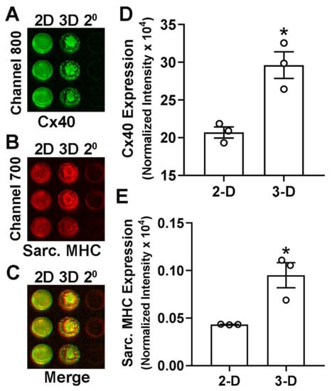 A direct comparison of E11.5 ventricular cells cultured under 2-D and 3-D conditions by western blot analysis indicated a significantly higher level of Cx40 expression (2-fold) in cells cultured for 8 days under 3-D conditions compared to those cultured in 2-D conditions (Figure 3D,E). Subsequently, an in-cell western detection technique was tested for marker protein expression levels in 2-D versus the 3-D cultures grown in microwell culture plates. In-cell western analysis also revealed significant increases in the expression of Cx40 and sarcomeric myosin protein levels in cells cultured under 3-D conditions compared to cells grown in 2-D cultures for 8 days (Figure 4, normalized for cellular DNA content).