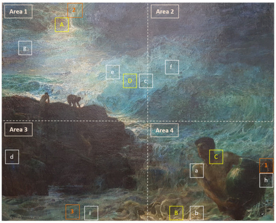 Plinio Nomellini, I Tesori del Mare (1901), 127 × 108 cm, Galleria Nazionale d’Arte Moderna e Contemporanea, Rome (IT). Image before the intervention with the indication of the investigated areas: sampling areas (1, 2, 3); acquisitions with DinoLite optical microscope (a–i); areas analyzed using Raman spectrometer (A–D); areas examined using Multispectral Imaging (Area 1–Area 4).