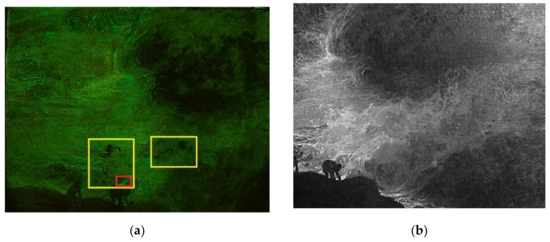 Area n° 3 includes part of the turbulent sea and the bottom area of the cliffs on which the waves lush out. Multispectral imaging in visible light unearthed the presence of the author’s black signature in block letters on the left-bottom area (Figure 1). This shows the same fluorescence detected in other areas of the painting, underlining the application of an unevenly spread varnish (Figure 2e). Once again, the IR image made it possible to precisely recognize both the underlying structure of the figuration and the white spots which appear to be the result of past restoration treatments (Figure 2f). Specifically, the two figures climbing the cliffs are well delineated by IR radiation, unearthing details that would not have been noticeable otherwise.