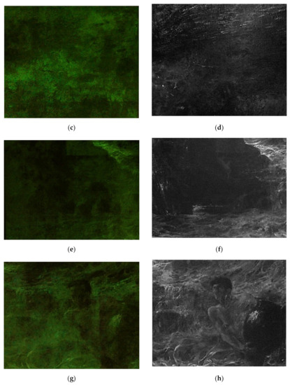 Due to the dimension of the artwork, the surface was ideally divided into four squares—i.e., areas n° 1, 2, 3, and 4—for careful examination through multispectral analysis (Figure 1). The acquired images show different fluorescence emission, varying from low to high fluorescence. The information collected through multispectral imaging allows the supposition that the highly UV-fluorescence-responsiveness should be ascribed to the presence of coating and fixing materials. Indeed, these areas were fixed, cleaned, and varnished during past restoration treatments. In addition, infrared images (IR) allowed for clearer visualization of the figure’s shapes, highlighting the differences among the different areas under IR radiation (Figure 2b,d,f,h).
