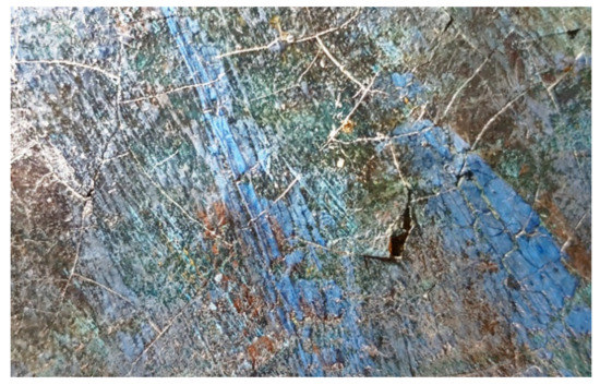Multispectral imaging was performed using infrared (IR), ultraviolet (UV), and visible (VIS) light sources. UV fluorescence enabled the acquisition of relevant information about the surface of the artwork, such as the eventual presence of the varnish, previous retouches, or non-original layers. Near- and Mid-Infrared (NIR-MIR) spectrum bands were used to examine the underneath layers of the pictorial film and to verify the presence of restored areas through the analysis of IR-active materials. The analysis was carried out using Madatec multispectral system, which consists of a full-spectrum Samsung NX500 Digital Camera (28.2 MP BSI CMOS) and Madatec spotlights with 365 nm (UV) wavelength. Images of the induced fluorescence were taken using the Yellow 495 52 mm F-PRO MRC 022 filter to reduce the blue component of the UV spotlight, thus better highlighting possible fluorescence effects [9,10,12]. An IR filter at 750 nm was used to acquire IR images. Portable digital microscope DinoLite AM411-FVW enabled further examination of the surface morphology at different magnifications—from 40× to 220×—and illumination modes—visible light (VIS), raking light (VIS-RAD), and ultraviolet light (UV). Raman spectroscopy was used to gain information about the molecular structure of the materials constituting the artwork, through the investigation of the spectral region of intra- and intermolecular vibrations. Raman spectra were collected using Oceanhood’s portable 785 nm Raman Spectrometer RK785-I instrument, using a 785 nm laser with power ranging from 0–150 mW coupled with a portable DinoLite digital microscope for beam spot analysis (500 μm spot). The typical resolution of the spectrometer is 4 cm−1.