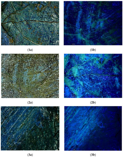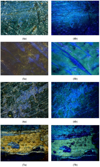 At a microscopic level, the fluorescence emitted by the top-layer is more noticeable. Indeed, the paint layer seems to be heterogeneously covered by a resinous varnish which shows yellow-green fluorescence when irradiated by UV light (Figure 42a–5b).