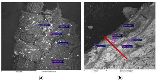 Another area of sample 1 was investigated, revealing almost the entire stratigraphy of the painting on different levels (Figure 5b, Table 2). The arrow in Figure 5b begins by the paint layer passing through the primer layer up to the preparation layer. On the first layers, EDS analysis highlights the presence of sulfur (S), which can be related to both calcium (Ca) and barium (Ba) (spectra 1–2, Figure 5b, Table 2). Barium is generally present in the paint layers as barium sulfate (BaSO4), namely a white extender commonly used for pigments, or as lithopone (BaSO4 and ZnS). Indeed, synthetic barium sulfate was developed in the early 19th century. Its transparency made it a good extender for oil colors and as inert substrates for lake pigments, while lithopone is a white pigment produced since 1874 and widely used in ground layers or as a filler [8,15]. Calcium could be linked to the presence of calcium sulfate (gypsum, CaSO4), which has been commonly used as a preparation layer from early medieval times until the modern era [8,16]. The analysis also highlighted the presence of zinc and lead in the primer layer (spectra 1–3, Figure 5b, Table 2), confirming the use of lead carbonate (Lead White), and either zinc oxide (Zinc White) or lithopone. The counts of oxygen and carbon were removed from Table 2, Table 3, and Table 4, because they were detected in all the acquired spectra, even though in variable quantities. Therefore, they cannot be considered characteristic of any chemical species. C and O counts were maintained in Table 1 and Table 5 because the high amount of C is linked to the cellulose of the canvas. Spectra 1, 3, and 4 detected the presence of silica (Si), aluminum (Al), magnesium (Mg), and iron (Fe), suggesting the use of Green Earth in the first paint layers [17]. This could be partially responsible for the bluish-green color of the paint layer, together with the presence of chromium (Cr), which could be attributed either to Chromium Oxide Green, Viridian (hydrated chromium (III) oxide), or a mixture of Chrome Yellow and Prussian Blue, due to the presence of Fe [18]. Lead White is detected in higher amounts here, probably indicating that it was used mixed with the other pigments to obtain a lighter tone.