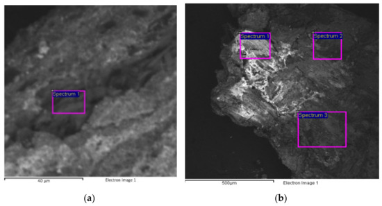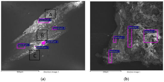SEM images showing other details of sample 1. Image of the crystal-like dark contrasting area corresponding to the first paint layer (a) with the indication of the analyzed areas corresponding to the results in Table 3. Image of the paint layers (b) with the indication of the analyzed areas corresponding to the results in Table 4.