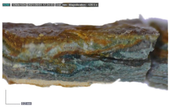 The peaks at 2931 and 2853 cm−1 (–C–H stretching) are related to the presence of aged linseed oil, which differs from the raw type for the missing peak at 2960 (–C–H stretching), 1101 (–C–O stretching), and 722 cm−1 (–C–H bending), and for the appearance of the peaks at 1394 (–C–H bending) and 1367 cm−1 (–O–H bending) [35]. Peaks that are common to either aged linseed oil or acrylic resin are those at 1721, 1451, 1394, 1367, 1235, 1159 cm−1, while the bands at 1270, 994, 970, 940, and 880 cm−1 seem to be related to the acrylic resin alone [41,42]. Eventually, the analysis further confirms both the use of linseed oil as a binder and the presence of a non-original layer presumably applied during past restoration treatments.