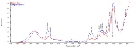 Spectra collected from the backside of the canvas (samples 1, 2, and 3) appear to be characterized by the typical cellulose bands of cotton or linen fibers, namely those at 3450–3320, 2925–2848, 1642, 1373, 1050, 1007, 897 cm−1 (Figure 9) [22]. In particular, the band near 897 cm−1 corresponds to the CH deformation of β-glycosidic linkages, which is related to the abundance of amorphous cellulose [23]. In addition, the peaks at 3450–3320 cm−1 (–O–H stretching), 2925 cm−1(–C–H stretching), 1642 cm−1 (–O–H bond vibrations including intermolecular hydrogen bonds between polysaccharide chains), and 1050 cm−1 (–C–O–C pyranose ring skeletal vibration) are characteristic of cellulose [24,25]. Even though cellulose fibers such as linen and cotton show similar FT-IR spectra, similarities with cotton fibers can be noticed in the acquired spectrum [26]. The hypothesis is supported by the spread production of cotton canvases in Italy at the beginning of the 20th century [27].