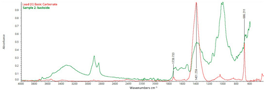 In addition, an in-depth analysis of the spectrum collected from the backside of the canvas of sample n. 2 once again highlighted the presence of characteristic peaks which can be related to cellulose, but also to Lead (II) Basic Carbonate [(PbCO3)2·Pb(OH)2] (Figure 10) [28]. Bands at 1401 and 686 cm−1 identify C=O vibrations in the carbonate ion CO32−, which can be attributed to the use of Lead (II) Basic Carbonate. In addition, the IR peaks at 1740 and 677 cm−1 are also typical of this compound. The presence of the so-called Lead White matches the dating of I Tesori del Mare because it has been used in almost every painting in Western art throughout the centuries until the first quarter of the 20th century [8]. Then, Zinc oxide (ZnO) gradually became to replace Lead White during the second quarter of the XIX century. Afterward, commercially produced Titanium White (TiO2) had begun to replace the toxic lead white pigment by the first quarter of the 20th century [8]. Eventually, the high peak at 1006 cm−1 identifies the presence of silica-based minerals such as kaolinite or ultramarine blue, while the presence of gypsum on the canvas detected by SEM/EDS analysis could not be confirmed by FT-IR ATR due to the thinness of the layer (Figure 10) [29,30,31].