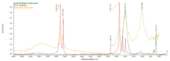 Once again, spectra collected by placing both the preparation layer and the top layer of samples n. 1 and 2 on the ATR diamond show bands attributable to Lead (II) Basic Carbonate (Lead White) and metal soaps constituting the paint layer (Figure 11) [32,33,34,35]. The peak at 1542 cm−1 is related to the asymmetrical stretching vibrations of COO− [36]. It can be attributed to the presence of metal soaps in the layer, which could either have been intentionally used as additives to modify the physical properties of the painting materials or be the result of chemical reactions between metal ions constituting the pigments and free fatty acids from lipidic binders (in this case, oil) [37,38,39,40]. In addition, the characteristic absorption band at 3565–3530 cm−1 is attributed to the vibrational motions of –O–H confirming the detection of both lead carbonate and linseed oil. The bands at 2960, 2855, and 1739 cm−1 are assigned to the vibrational asymmetrical stretching of –C–H2, vibrational symmetrical stretching of –C–H2, and –C=O of the triglyceride cross-linked network characteristic of siccative oils.
