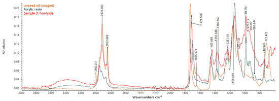 The spectrum collected on the front of sample 3 was compared with unaged linseed oil and an acrylic resin used as a finishing and retouching varnish (Figure 12). The spectrum shows the characteristic bands of both aged linseed oil and acrylic resins (Figure 12).