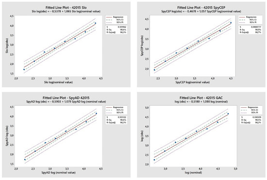 Linearity was assessed by testing samples independently diluted (eight dilution points, 2-fold apart, from neat to 1:128 diluted sample) prior to performing the standard assay considering each dilution a test sample. A high correlation between observed IgG titres and nominal IgG titres at each specific dilutions was observed for all four antigens across a range of dilutions from neat to 1:128, treated independently in the assay (Figure 3).