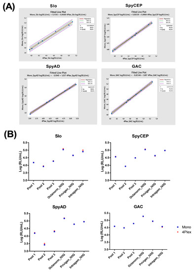 Finally, three different human-pooled sera and IVIG were tested as samples to compare the performance of the monoplex assay to multiplex assay, demonstrating high correlation and linearity between values obtained in monoplex and multiplex (Figure 4A), as well as the ability to appropriately determine antibodies with a broad range of concentrations (Figure 4B).