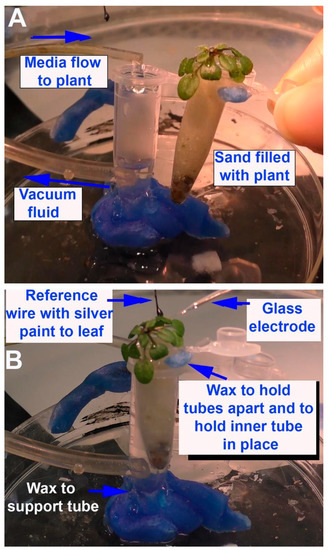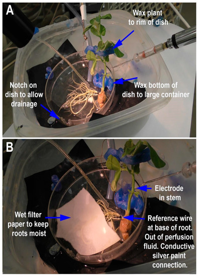Illustration of the flow-through for Pisum sativum: (A) The plant is held in place by wax to prevent movement. Placement of the plant needs to be considered to provide ease of access to the stem for placing of the electrodes and of the tubes to provide solutions; (B) the smaller tube to provide the compounds to be tested is placed within the outflow of the background continuous basal salt flow-through from the larger tube. The reference wire is placed on the base and connected to the plant with conductive silver paint. The reference wire is to be placed in a way so as not to be in contact with the flow-through solutions. The recording electrode is placed in a stable location in the stem so vibrations of the plant will not disturb the recording. The filter paper is placed over many of the roots to maintain moisture levels, and to diffuse various solutions onto the roots.