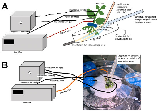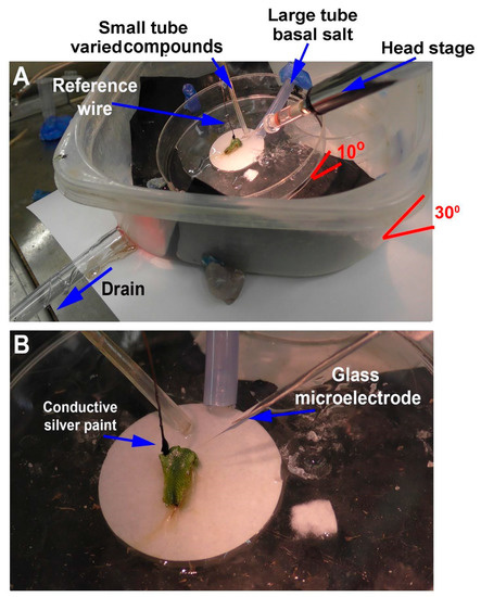 Another approach was used for P. sativum with roots a few centimeters in length. The roots were removed from the soil in the starting tray and gently rinsed with half-strength basal salt. The roots were then placed in a 100 × 15 mm Petri dish with half-strength basal salt 24 h prior to recordings, with moist filter paper covering the roots to prevent the roots from drying out. The plants were then moved to the recording dish which was fixed in place. The recording dish was a 100 × 15 mm Petri dish maintained at a 30 to 40 degree slope and a notch was made at the lower side, allowing the compounds to drain. A larger plastic container on the floor collected the used solution (see schematic in Figure 2). The basal salt in which the roots were placed was used to provide constant flow-through via a constant stream above the roots at a rate of 80 mL/min, delivered by standard 14 L/S tubing (Cole-Parmer, Vernon Hills, IL 60061, USA). A smaller tube (ID 1.6 mm) was directed at a subset of roots with basal salt and switched to glutamate (1 mM) in basal salt at a rate of 40 mL/min (Figure 2). A setup using P. sativum in place with the reference and recording electrode, as well as the tubes for flow-through of the solutions, is shown in Figure 3A. The roots were covered with filter paper wetted with the same basal salt (Figure 3B). The solution for the smaller tube was switched back and forth from the glutamate solution to basal salt at various times to examine repetitive exposure to glutamate. The glutamate was flushed off the roots with the same basal salt as provided in the background flow-through. To examine if the disturbance from changing the tubing to the solution containing glutamate caused an electrical response, controls were performed by changing the solution to a control solution (basal salt). When changing solutions, the pump was not turned off and a small amount of air in the tube could be observed when the next solution was in contact with the roots. Thus, this allowed one to observe when glutamate was contacting the roots/rhizoids without the use of a dye. The responses of three model plants were examined for the proof of concept regarding the effect of glutamate on the electrophysical responses of the plant. The large tubing used a Masterflex Standard long-shaft pump (Cole-Parmer, Vernon Hills, IL 60061, USA) and the smaller tubing used a Masterflex pump (Cole-Parmer, Vernon Hills, IL 60061, USA; model # 7014.) (Video S2: https://www.youtube.com/watch?v=6J6G70iW2pM, 1 June 2022).