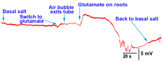 Electrophysiological recording from Arabidopsis thaliana during the flow-through of the roots with basal salt and glutamate. When glutamate (1 mM) came in contact with the roots, depolarization in the plant occurred.