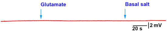 Electrophysiological recording from Marchantia inflexa during the flow-through of basal salt and glutamate on the roots. When glutamate (1 mM) came in contact with the rhizoids, no change in electrical response was measured.