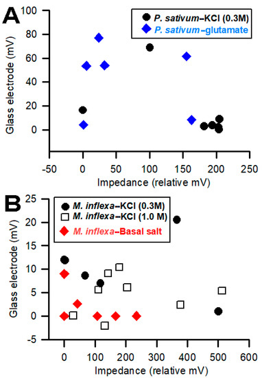 Representative illustrations of the recording arrangements are shown—in Figure 5A for P. sativum and Figure 5B for M. inflexa—for the simultaneous recording with the impedance measures and the glass electrode for the potential measures across the plant inner surface and outer surface.