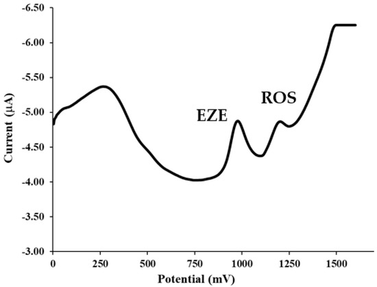 The AdSDPV voltammograms of 5.0 × 10−6 M EZE and 7.5 × 10−6 M ROS in 0.1 M H2SO4 (stripping conditions: accumulation potential of 0.0 V and accumulation time of 15 s).