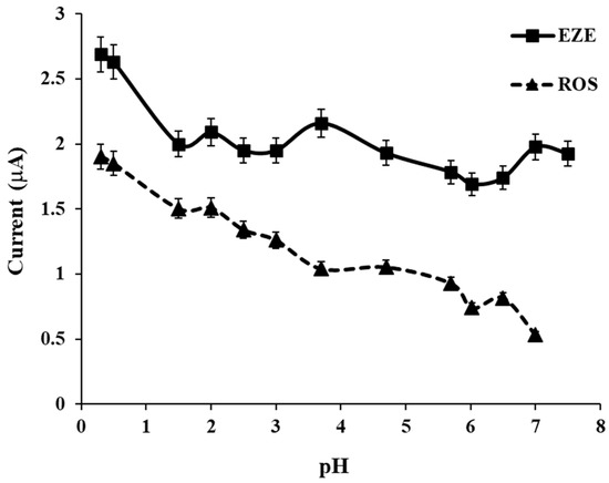 The electrochemical behavior of ROS and EZE was studied within a wide pH range (pH 0.3–7.0) using the DPV technique on a GCE. With the DPV method, the maximum current occurred in the 0.1 M H2SO4 medium. The following equation followed the effect of pH on the peak potential. The Ep-pH plots indicated that a pH increase caused the shifting of peak potentials to less positive values (Figure 2).