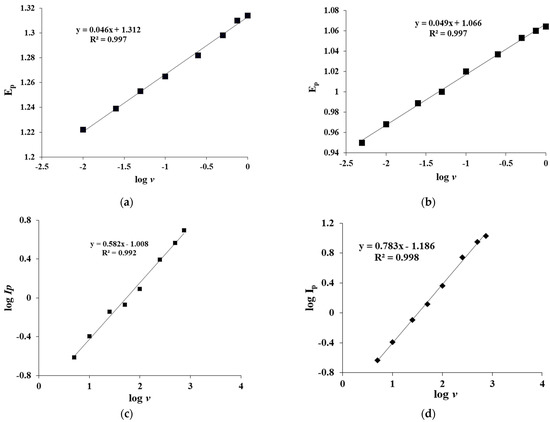 Moreover, the logarithm of peak current vs. the logarithm of scan rate gives more detailed information about the electrochemical mechanisms. When these graphs were plotted, for EZE, from the slope of the equation log (Ip) = 0.783 log v − 1.186 (r = 0.998), it can be concluded that the reaction is adsorption-controlled since the slope was close to 1. Thus, as a result of the scan rate experiments, in the 0.1 M H2SO4 medium, the electrochemical behavior of EZE was found to be adsorption-controlled (Figure 3d).