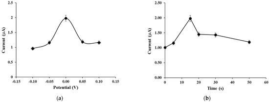 Parameters, such as deposition time and potential, significantly affect the AdSDPV peaks of the analytes. Hence, these parameters as related to AdSDPV were optimized to obtain the best results for the determination of ROS and EZE. The effect of the deposition time on stripping peak current was studied in the range of 0 s to 50 s, with 0 V deposition potential. It was observed that the peak current increased between 0 and 15 s (Figure 4). However, after 15 s, a decrease was observed in the peak current. As a result, 15 s was selected as the optimum deposition time. The effect of deposition potential, which is another important parameter, on stripping peak currents was studied in deposition potentials ranging from −0.1 V to +0.1 V, with a constant accumulation time of 15 s (Figure 4). A decrease in stripping peak currents was observed after the 0 V deposition potential, with an accumulation time of 15 s. A deposition time of 15 s and a deposition potential of 0 V, at which the maximum peak current was observed, were used in all subsequent experiments (Figure 4).