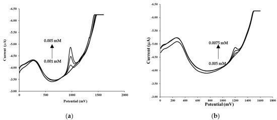 AdSDPV of sensor in various concentrations of (a) EZE and (b) ROS using the AdSDPV technique in 0.1 M H2SO4 (stripping conditions: accumulation potential of 0.0 V and accumulation time of 15 s).