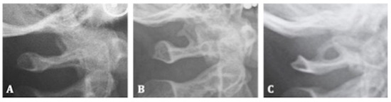 - Lachman, R.S. The cervical spine in the skeletal dysplasias and associated disorders. Pediatr. Radiol. 1997, 27, 402–408. [Google Scholar] [CrossRef]