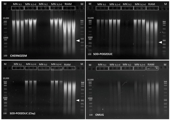 Electrophoretic separation of DNA isolated from four types of substrates with the NucleoSpin Soil kit with four different buffers and with the RIAM protocol developed in this study. M—molecular weight marker. MN SL1, SL1+E, SL2, SL2+E—buffer versions of NucleoSpin Soil kit (Macherey-Nagel, Germany). The white triangle marks a place where a weak band of 16S rRNA is visible.