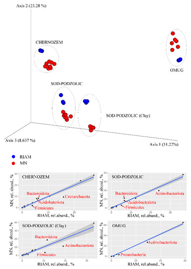 16S rRNA high-throughput sequencing analysis results. In the upper part of the figure, the analysis of β-diversity (PCoA based on the weighted UniFrac metric) is presented. MN—four buffer variants with NucleoSpin Soil kit, RIAM—the protocol developed in this study. In the lower part of the figure comparison of relative abundances of prokaryotic phyla is plotted demonstrating the difference in abundances in MN libraries (the mean for all buffers) and RIAM. Phyla with statistically significant differences in abundance are indicated.
