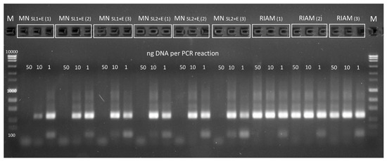 It should be especially noted that the DNA preparation isolated from the highly problematic substrate OMUG differs not only quantitatively, but also in the fact that it does not inhibit the PCR reaction even at a high amount of DNA in the reaction (Figure 3, Table 1). DNA isolated from other soils using the MN and RIAM protocols did not inhibit PCR. The latter is important for the detection of minor components of soil microbiota, since a commonly used dilution of the template DNA before PCR in order to avoid inhibition can lead to the disappearance of minor components of the microbiota from the NGS libraries.