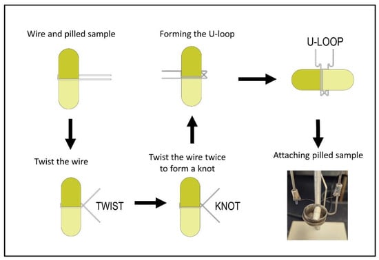 Next, prepare the pilled sample for combustion by placing the combustion vessel with the fuse on a support stand, as shown in Figure 3. Unravel approximately 25 cm of the ignition wire and wrap it around the pilled sample, forming a “U” shape around the pill (Figure 3). Grasp the ignition wires tightly with one hand and twist the pilled sample so that a tight knot forms in the ignition wire without damaging the gelatin capsule. Carefully place the pilled sample with the ignition wire into the combustion cup and then fasten the wire between the two electrodes. Pinch the ignition wire around the capsule, so that the wire is in direct contact with the capsule.